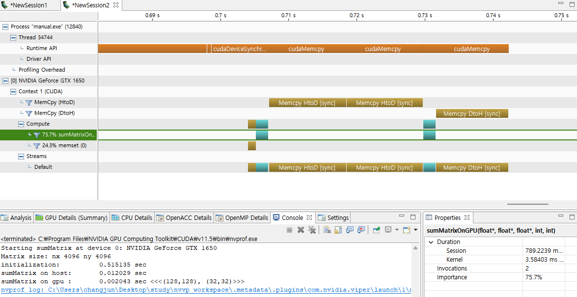 다음은 Unified Memory를 사용하지 않은 manual.exe를 nvvp로 실행한 결과입니다.