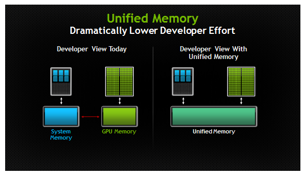 일반적인 PC에서 CPU와 GPU의 메모리는 PCIe BUS에 의해서 물리적으로 구분되고 분리됩니다. CUDA 6 이전까지는 CPU와 GPU 간에 공유되는 데이터는 두 메모리에 모두 할당되어야 하며, 프로그램에서 명시적으로 전달되어야 했습니다.