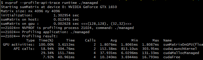 Host에서 수행되는 matrix sum 함수가 실행될 때, 이미 전체 matrix가 이미 CPU에 상주하고 있기 때문에 실행 시간은 유사합니다. 그리고, 워밍업으로 커널이 한 번 수행되는데, 이때 사용되는 matrix가 device로 다시 마이그레이션합니다. 따라서 실제 수행 시간을 측정하는데 사용되는 커널이 실행될 때에는 해당 matrix 데이터가 GPU에 존재하는 상태입니다. 만약 워밍업 커널이 실행되지 않는다면 managed memory를 사용하는 커널의 실행 속도는 훨씬 더 느려질 것입니다.