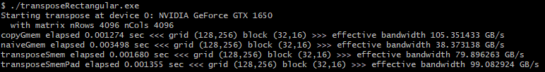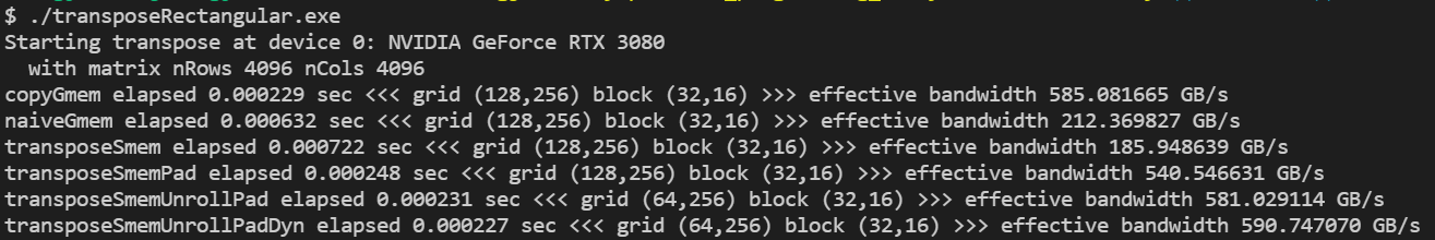 RTX 3080으로 테스트해 본 결과, transposeSmemPad 보다 조금 더 좋은 bandwidth가 측정되었습니다.