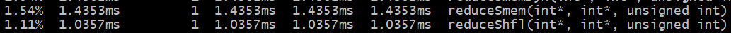 컴파일 후, nvprof로 성능을 측정해보면 다음의 결과를 확인하실 수 있습니다.