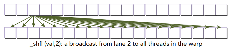 아래 그림은 __shfl 함수가 지정된 lane으로부터 모든 스레드로 broadcast operation을 수행하는 것을 보여줍니다.
