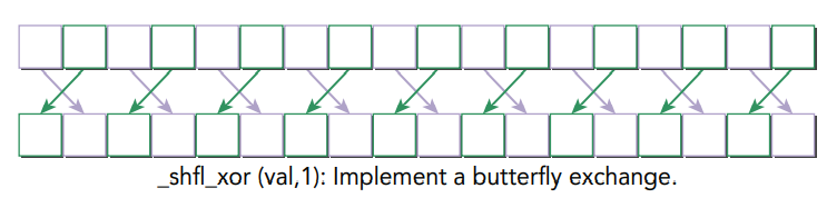 이 함수는 이를 호출한 스레드의 lane index와 laneMask를 XOR 연산하여 source lane index를 계산합니다. 그리고 해당 source thread로부터 전달된 var 값을 리턴합니다. 이 명령은 butterfly addressing pattern으로 데이터를 교환합니다.