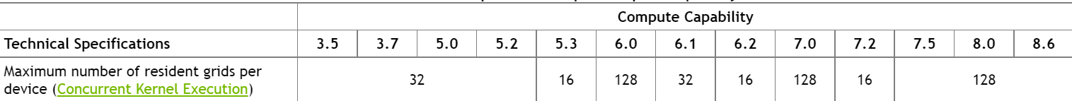 NVIDIA의 공식 문서에서 Compute Capability에 따른 concurrent kernel의 최대 개수는 다음과 같습니다.