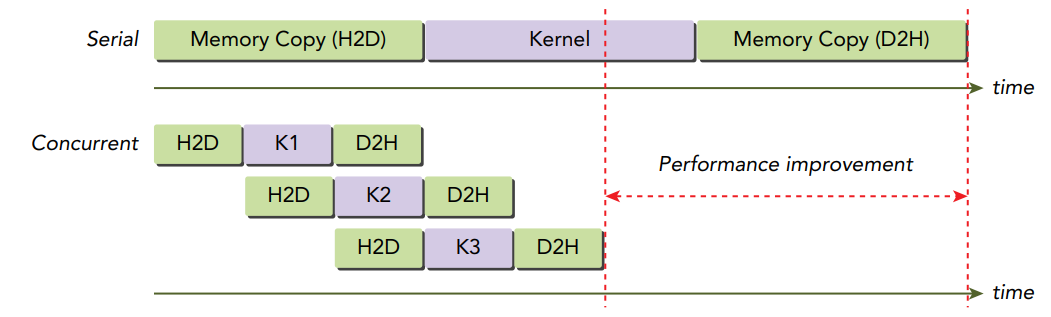 많은 경우에 data를 전송하는 것보다 커널을 실행하는 데 더 많은 시간을 사용합니다. 이러한 상황에서 완전히 CPU-GPU communication latency를 숨길 수도 있습니다. 커널 실행과 데이터 전달을 다른 스트림에 dispatch함으로써, 이 operation들은 오버랩될 수 있고, 프로그램의 총 수행 시간은 짧아집니다.