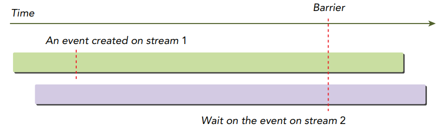 cudaStreamWaitEvent는 cudaStreamWaitEvent가 호출된 이후에 스트림에서 대기 중인 작업을 실행하기 전, 지정된 스트림이 지정된 이벤트를 기다리도록 합니다. 이벤트는 동일한 스트림 또는 다른 스트림과 연관될 수도 있습니다.