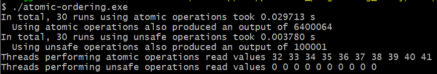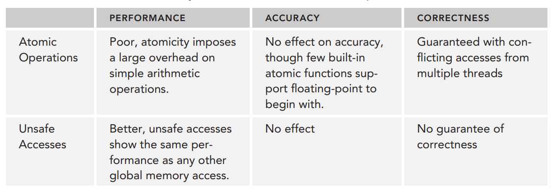 성능면의 차이는 명백하게 드러납니다. atomic 커널은 unsafe 커널보다 약 10배정도 느립니다. 하지만 마지막 결과를 보면 덧셈 수행이 unsafe에서 완전히 수행되지 않은 것을 볼 수 있습니다. 이는 unsafe 커널은 global memory에서 동작하여 값을 덮어쓰기 때문입니다.