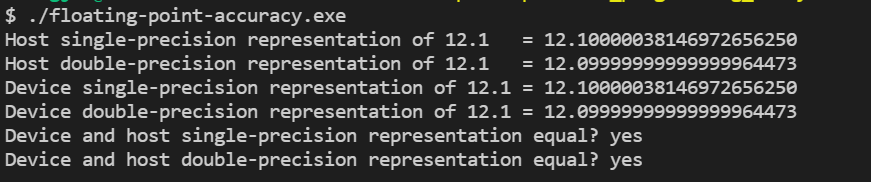 host와 device에서 12.1을 동일한 근사치로 표현하지만, 둘 다 정확한 값을 저장하지는 못합니다. 이 예제 코드에서 배정밀도의 값이 단정밀도보다 12.1에 조금 더 가깝습니다.