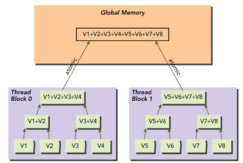 다행히, atomic operations가 필요할 때 성능 하락 폭을 감소시킬 수 있는 기법이 있습니다. 바로 global atomic operations를 local step으로 나누어 각 스텝에서 동일한 스레드 블록에서의 스레드로부터 중간 결과값을 생성하도록 하는 것입니다. 이는 local이며, lower-latency 리소스를 사용하여 각 스레드 블록으로부터의 부분 결과를 생성하도록 합니다. 그리고 마지막에 atomic operations를 사용하여 부분 결과들을 마지막 결과에 합해줍니다.