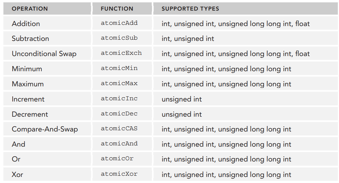 CUDA는 여러 atomic 함수들을 지원합니다. 지원되는 atomic 함수들은 compute capability에 따라서 조금씩 다릅니다.