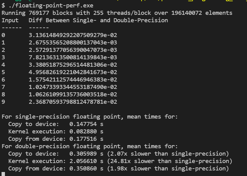 위 예제 코드는 float와 double 타입의 input 배열을 생성하고, GPU로 복사한 후 반복적으로 산술 연산이 포함된 커널을 수행하고 다시 그 결과값을 Host로 복사합니다.