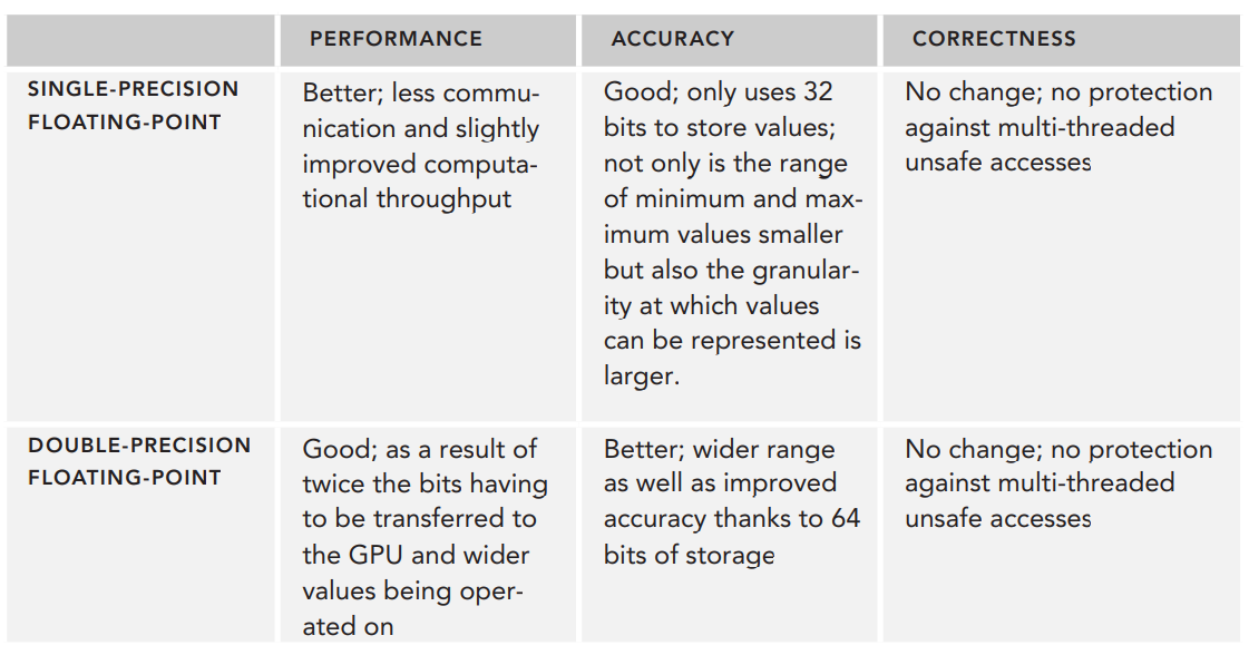 또한, 배정밀도의 값은 단정밀도의 값이 차지하는 공간의 2배를 차지하므로, 레지스터에 double 타입을 저장할 때 스레드 블록에서 공유되는 레지스터는 float 타입을 사용할 때보다 줄어듭니다.