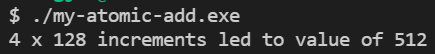 위 커널을 128개의 스레드를 갖는 4개의 블록으로 configuration하여 실행하면 다음의 결과를 얻을 수 있습니다. 512개의 스레드에 의해서 결과값은 512가 됩니다.