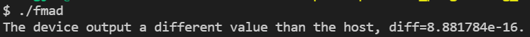 MAD를 비활성화하면 host와 device에서의 결과가 일치합니다. 그러나 device 커널은 이제 이 연산을 수행하기 위해 더 많은 명령어를 필요로 할 것입니다.