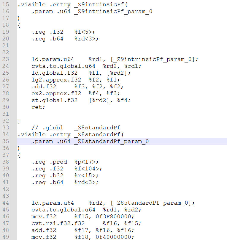 standard와 intrinsic 함수 간의 차이점을 시각적으로 확인하는 방법은 각 함수에 대해 CUDA 컴파일러가 생성한 명령어를 확인하는 것입니다. nvcc에 --ptx 플래그를 사용하면 컴파일러가 프로그램의 중간 생성물을 만들도록 하며, 이는 최종 실행 파일이 아닌 PTX(parallel thread execution) ISA(instruction set architecture) 입니다. PTX는 x86 프로그래밍의 어셈블리와 유사하며, 작성한 커널코드와 GPU에 의해서 실행되는 명령어 사이의 중간 명령어를 보여줍니다.