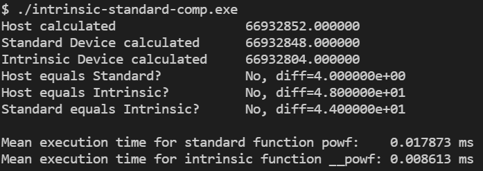 standard와 intrinsic 함수는 성능뿐만 아니라 정밀도 측면에서도 서로 다릅니다. 이를 테스트하기 위해 다음의 예제 코드를 살펴보도록 하겠습니다.