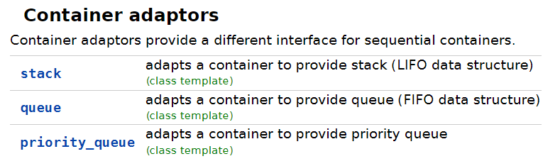 컨테이너 어댑터(container adapter)는 순차 컨테이너에 대한 간편한 인터페이스를 제공합니다. C++에서는 위에서 보여주는 std::stack, std::queue, std::priority_queue를 제공합니다.
