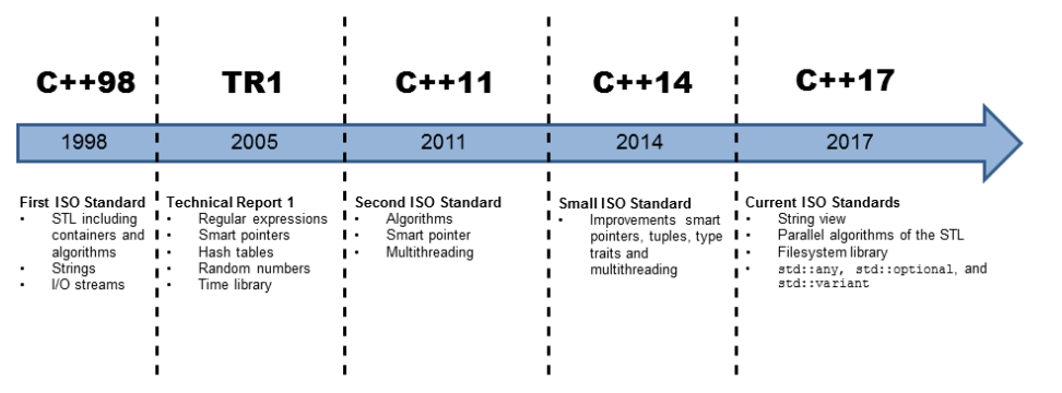 C++17부터는 파일 시스템 라이브러리, std::any, std::optional이란 데이터 타입이 새롭게 추가되었습니다. C++20부터는 네트워크 프로그래밍 라이브러리와 템플릿 파라미터에 대한 타입 시스템이 추가되고 멀티스레딩에 대한 지원이 향상되었습니다.