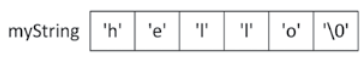 C String을 다룰 때 가장 많이 하는 실수는 \0 문자를 담을 공간을 깜박하고 할당하지 않는 것입니다. 예를 들어, 'hello'라는 문자열을 구성하는 문자는 5개이지만, 메모리에 저장할 때는 문자 여섯개만큼의 공간이 필요합니다.