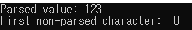 ptr은 변환에 실패한 경우에 첫 번째 문자에 대한 포인터가 되며, 변환에 성공한다면 last와 같습니다. 변환된 문자가 하나도 없다면 ptr은 first와 같으며, 에러 코드는 errc::invalid_argument가 됩니다. 만약 파싱되는 값이 너무 커서 지정된 타입으로 표현할 수 없다면 에러 코드 값은 errc::result_out_of_range가 됩니다. 참고로 from_chars()는 앞에 나오는 공백을 무시하지 않습니다.