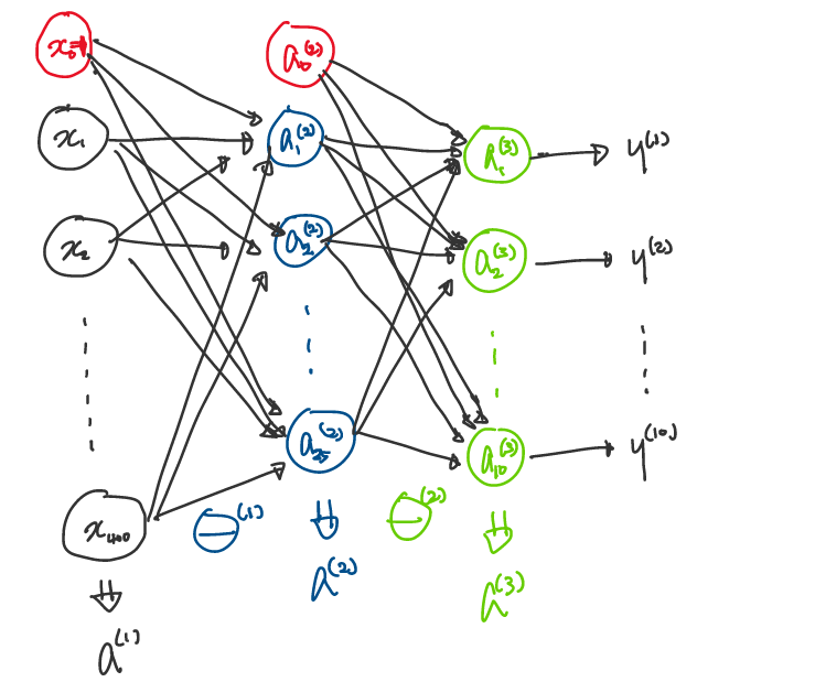 즉, \(\Theta^{(1)}\)은 25 x 401 matrix, \(\Theta^{(2)}\)는 10 x 26 matrix가 된다. Layer가 넘어갈 때마다 bias unit(\(a_0^{(j)} = 1\)이 추가되기 때문에 이전 단계 input 갯수에서 +1씩 된다.