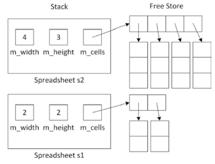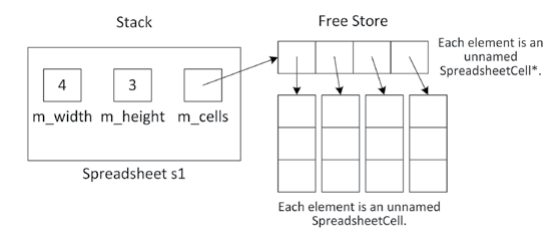아래 그림은 너비 4, 높이 3의 크기를 가진 s1이라는 Spreadsheet 객체가 스택에 할당되었을 때 메모리 상태를 보여줍니다.