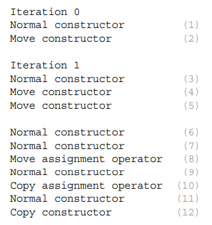 2번째 반복을 실행할 때, Spreadsheet 객체가 다시 생성되면서 일반 생성자(3)을 호출합니다. 이 시점에서 vector는 원소를 하나만 가지고 있습니다. 따라서 두 번째 객체를 담을 수 있도록 공간을 다시 조정합니다. vector의 크기가 변했기 때문에 이전에 추가한 원소를 새로 크기를 조정한 vector로 이동시켜야 합니다. 그래서 이전에 추가한 원소마다 이동 생성자가 호출됩니다. 현재는 vector에 원소가 하나뿐이어서 이동 생성자(4)도 한 번만 호출됩니다. 마지막으로 새로 생성한 Spreadsheet 객체를 이 객체의 이동 생성자(5)를 통해 vector로 이동시킵니다.