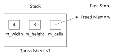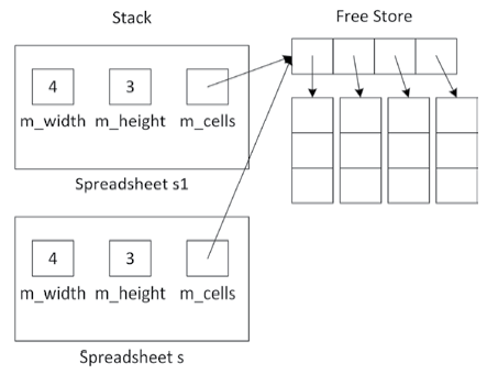 Spreadsheet 클래스에서 m_cells 배열에 대해 일반 포인터를 사용하고 있습니다. 이번 포스팅에서는 동적 메모리 할당의 결과와 클래스에서 동적 메모리를 다루는 방법을 설명하기 위해 일부러 이렇게 작성했지만, 실제로는 std::vector를 비롯한 표준 C++ 컨테이너를 사용하는 것이 좋습니다.
