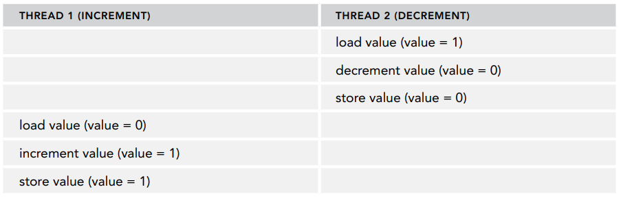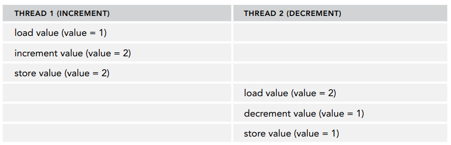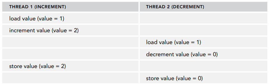 예를 들어 공유 변수가 하나 있는데 어떤 스레드는 이 값을 증가시키고, 또 어떤 스레드는 이 값을 감소시키는 경우를 생각해봅시다. 값을 증가시키거나 감소하려면 현재 값을 메모리에 읽어서 증가나 감소 연산을 수행해야 합니다.