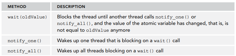 C++20에는 아래 표의 메소드들이 std::atomic과 atomic_ref에 추가되었는데, 이를 사용하면 아토믹 변수가 수정될 때까지 효율적으로 기다릴 수 있습니다.