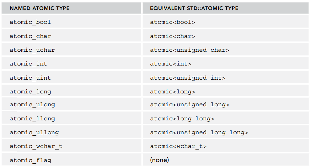 아토믹 타입을 사용하려면 <atomic> 헤더 파일을 인클루드해야 합니다. C++ 표준은 언어에서 제공하는 모든 기본 타입마다 이름이 지정된 정수형 아토믹 타입(named integral atomic type)을 정의하고 있습니다.