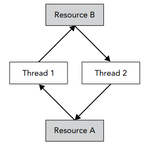 스레드 1은 A 리소스에 대한 접근 권한을 확보한 상태에서 B 리소스의 접근 권한을 얻을 때까지 기다리고, 스레드 2는 B 리소스의 접근 권한을 확보한 상태에서 A 리소스의 접근 권한을 얻을 때까지 기다립니다. 위 그림을 보면 데드락 상황이 순환 관계를 이루고 있으며, 결국 두 스레드는 서로를 무한정 기다리게 됩니다.