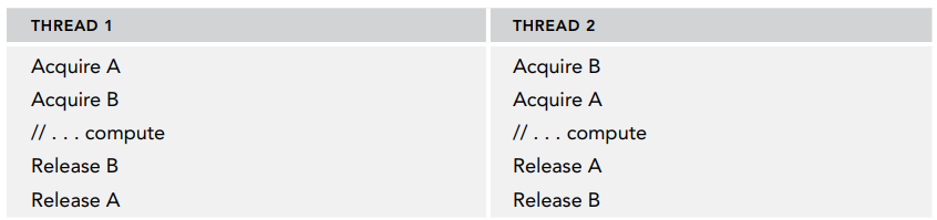 이때 공유 리소스에 대한 접근 권한을 얻는 방법에는 뮤텍스라는 것이 있습니다 (뒤에서 뮤텍스에 관해서 설명하도록 하겠습니다). 예를 들어 스레드가 두 개 있고 리소스도 두 개 있을 때 이를 A와 B라는 뮤텍스 객체로 보호하고 있다고 해봅시다. 이때 두 스레드가 각 리소스에 대한 접근 권한을 얻을 수 있지만, 그 순서는 다음 표와 같이 서로 다른 경우들에 대해 살펴보도록 하겠습니다.
