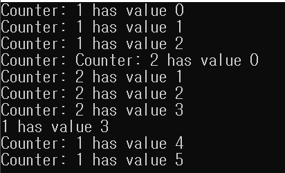 std::cout << "Counter: " << id << " has value " << i << std::endl;
