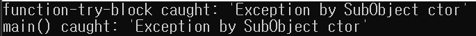 - catch문이 함수 try 블록에서 익셉션을 잡으면 생성자의 실행을 정상적으로 마친 베이스 클래스나 그 객체로 된 멤버는 catch문이 시작하기 전에 소멸된다.