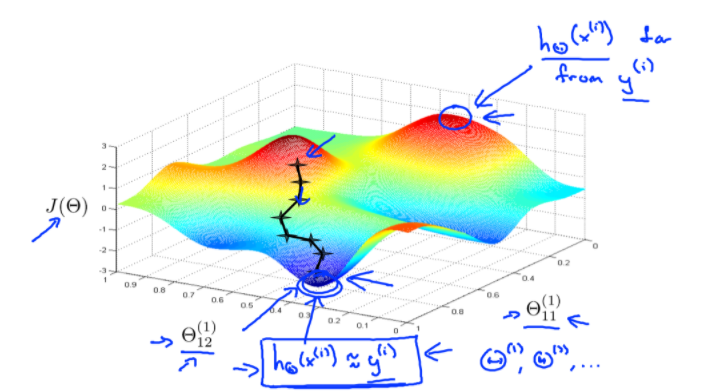 NN의 경우에 Cost Function \(J(\Theta)\)가 non-convex해서 Local Optima로 수렴할 수도 있다. 하지만, 일반적으로는 큰 문제가 아니고, Global Optima을 찾는다고 보장할 수는 없지만 Gradient Descent나 다른 Optimization Method에서 매우 적합하게 잘 동작한다. 그래서 Cost Function \(J(\Theta)\)를 최소화하고, Global Optima에 도달하지 않더라도 아주 좋은 Local Optima을 얻을 수 있다.