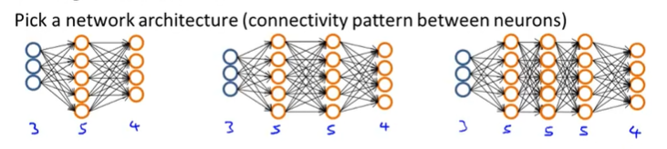 NN을 학습시키기 위해서는 먼저 Network Architecture를 선택해야 한다. 즉, 뉴런들 을 어떠한 구조로 연결시킬 지에 대해서 결정해야 한다. 즉, Input과 Output의 unit 개수, Hidden Layer의 개수와 각 Hidden Layer unit의 개수를 결정해야 하고, 이에 따라 Network Architecture는 달라진다.