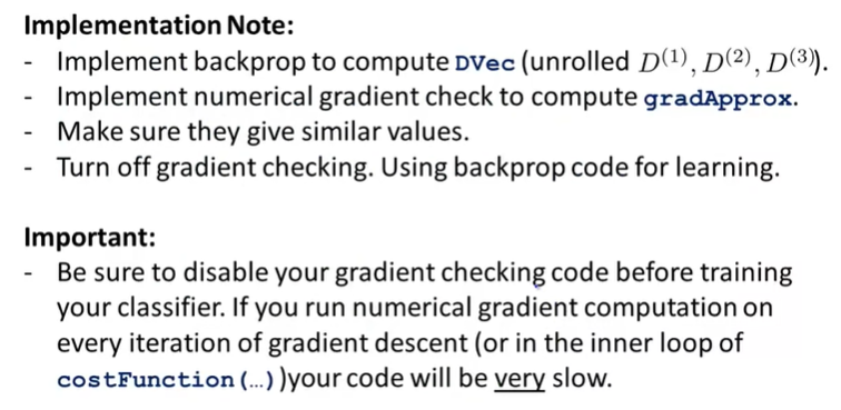 정리하자면, BP로 미분계수 DVec를 구하고, Gradient Checking을 통해서 gradApprox를 계산한다. 그리고, 두 vector를 비교해서 유사한지 확인하고, Gradient Checking을 끄고, Training을 계속 진행한다.