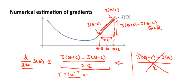 gradApprox = (J(theta + EPSILON) - J(theta - EPSILON)) / (2*EPSILON)