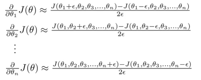 $$\frac{\partial}{\partial\Theta_j}J(\Theta) \approx \frac{J(\Theta_1, ..., \Theta_j + \epsilon, ..., \Theta_n) - J(\Theta_1, ..., \Theta_j - \epsilon, ..., \Theta_n)}{2\epsilon}$$
