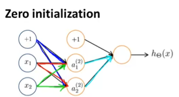 위와 같은 NN에서 우리가 모든 i, j, l에 대하여 \(\theta_{ij}^{(l)} = 0\)으로 초기화했다고 가정해보자.
