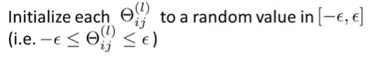 즉, 모든 i, j, l에 대하여 parameter \(\Theta_{ij}^{(l)}\)은 \(-\epsilon\)이상 \(\epsilon\)이하의 값을 랜덤하게 갖고도록 초기화한다.