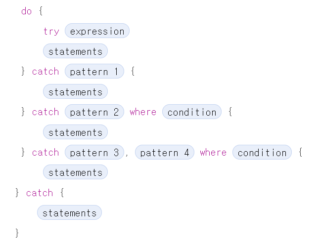 catch문 뒤에서 처리할 수 있는 에러를 적는 패턴을 작성할 수 있습니다. 만약 catch절이 패턴을 가지고 있지 않다면, 이 catch절은 모든 에러와 일치하고 해당 에러를 error라는 로컬 상수로 바인딩합니다.