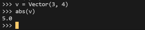 내장된 abs() 함수는 정수나 실수의 절댓값을 반환하며, complex 타입의 경우에도 값을 한 개만 반환합니다. 따라서 우리가 구현할 API 역시 벡터의 크기를 계산하는 데 abs() 함수를 사용하도록 할 것입니다.