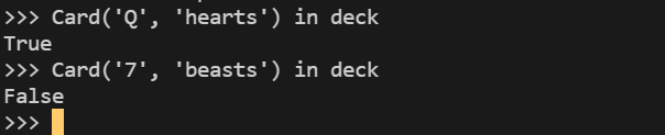 반복은 암묵적으로 수행되는 경우도 많습니다. 컬렉션에 __contains__() 메소드가 없다면 in연산자는 차례대로 검색(sequential scan)합니다. 예를 들어 FrenchDeck 클래스의 경우 반복할 수 있으므로 in이 동작합니다.