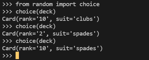 deck에서 임의의 카드를 골라내려면 메소드를 따로 구현해야 할까요? 파이썬에서는 그럴 필요가 없습니다. 파이썬은 시퀀스에서 항목을 무작위로 골라내는 random.choice()라는 메소드를 제공합니다. 따라서, deck 객체에 다음과 같이 적용만 해주면 됩니다.