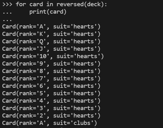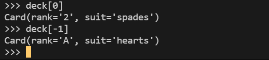 또한, 카드 한 벌(deck)에서 특정 카드를 읽을 수도 있습니다. 예를 들어, deck[0]은 첫 번째 카드, deck[-1]은 마지막 카드를 읽습니다. 이 기능은 __getitem__() 메소드가 제공합니다.