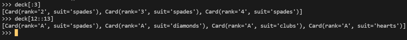 __getitem__() 메소드는 self._cards의 []연산자에 작업을 위임하므로 deck 객체는 슬라이싱(slicing)도 자동으로 지원합니다. 새로 생성한 deck 객체에서 앞의 카드 세 장을 가져오고, 12번 인덱스에서 시작해서 13개씩 건너뛰어 에이스만 가져오려면 다음과 같이 작성해주면 됩니다.