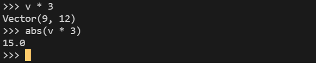 이제 Vector 클래스의 구현을 살펴보겠습니다. 아래 코드는 __repr__(), __abs__(), __add__(), __mul__() 스페셜 메소드를 이용하여 위에서 언급한 연산들을 구현한 Vector 클래스입니다.