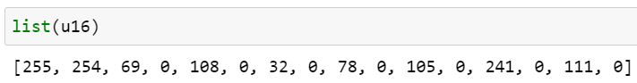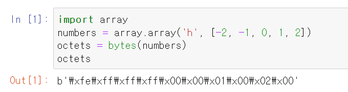 여기서 'h' 타입코드는 short int(16비트) 타입의 배열을 생성합니다. octets은 numbers를 구성하는 바이트들의 사본을 가지고 있으며 octets은 다섯 개의 short int 타입을 나타내는 10바이트입니다.